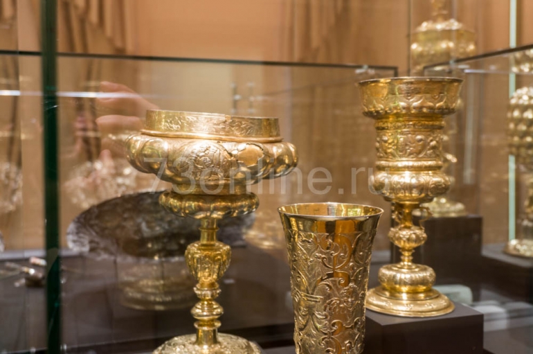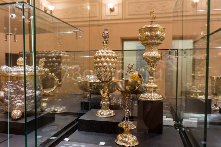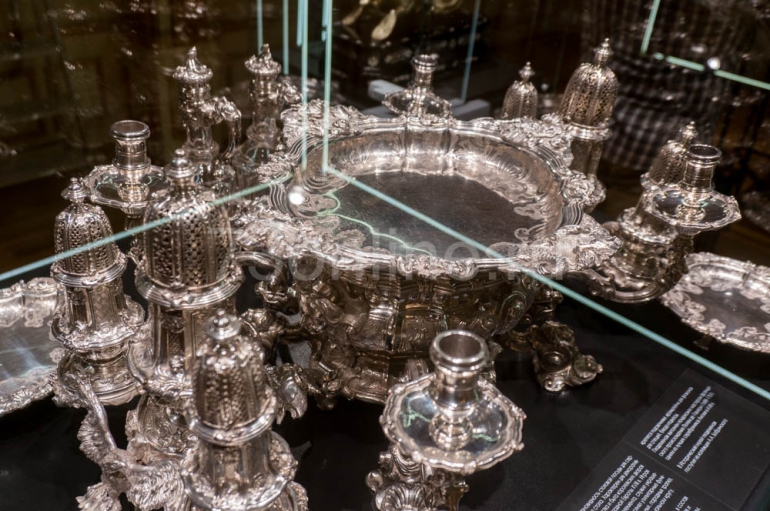 Посетителей ожидают четыре зала и 87 предметов (согласно музейной учетной документации), расставленных в хронологическом порядке существовавших художественных стилей – ренессанс, барокко, рококо, классицизм, историзм и модерн. Все без исключения – шедевры, лучшее из фондов столичного ГИМа: сервизы, кубки, украшения стола… Датируются они 16-м – началом 20 века, изготовлены мастерами из Англии, Франции, Германии, Польши, Голландии. Есть, к примеру, изделия известной семьи немецких ювелиров Ямницеров, французского ювелирного дома «Одье», существующего и сегодня.
