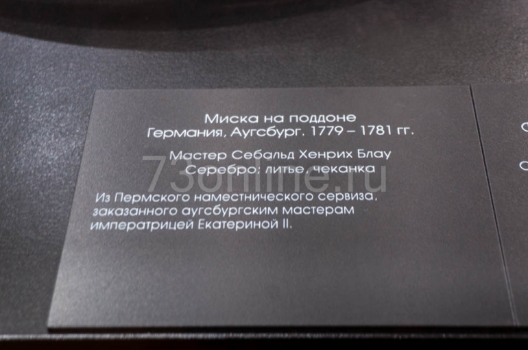 Например, миска в составе сервиза, заказанного у мастера из Аугсбурга Екатериной II для Пермского наместничества. Так императрица, путешествия, была избавлена от необходимости возить повсюду столовые приборы из Петербурга, соответствующие ее статусу. Кроме того, повышался и статус наместничества.