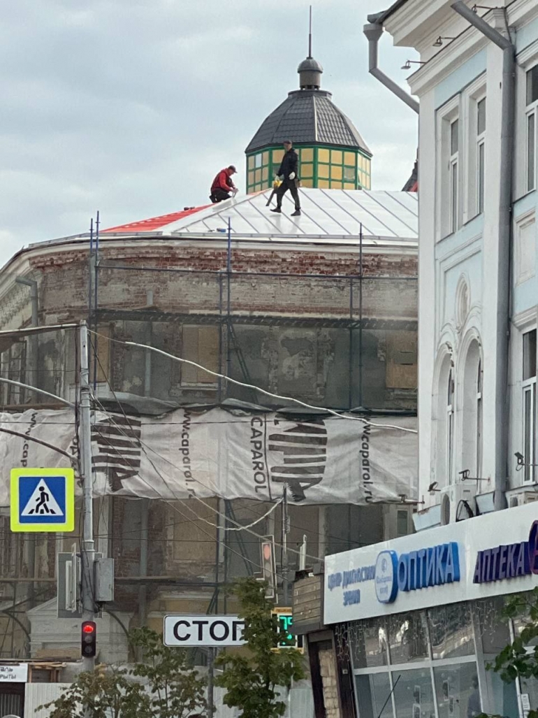В здании предстоит провести работы на фасаде, усилить фундамент и фасад, заменить кровлю и отремонтировать часть помещений. На момент подготовки публикации строители частично оголили фасад дома до красного кирпича и приступили к перекрытию кровли.