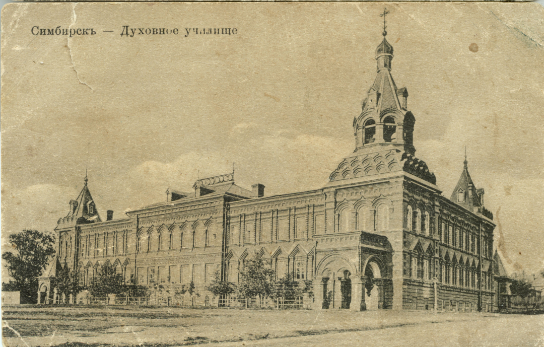 Красивый, как резной дом из красного кирпича за «колючим садиком» был построен Симбирской епархией в 1893 году – специально для размещения в нем духовного училища. Здание располагалось недалеко от Покровского монастыря и выходило главным фасадом на Покровскую площадь. Автором проекта стал известный и талантливый архитектор Михаил Григорьевич Алякринский.