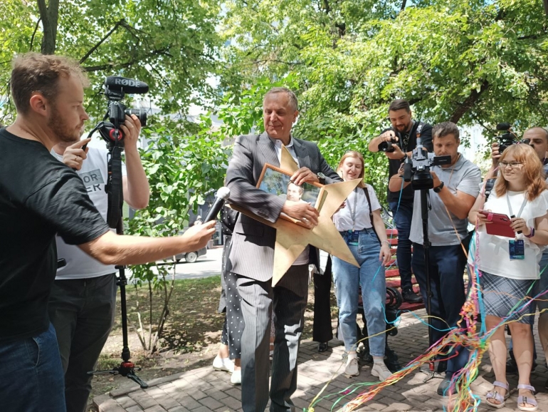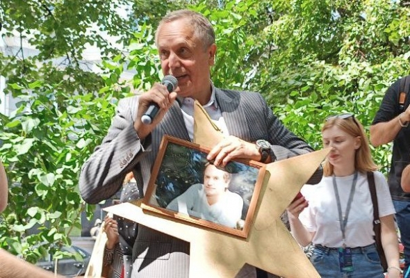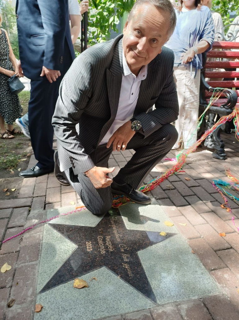 Напротив Соколова поставили ретрофотоаппарат: «Внимание, сейчас вылетит птичка!». Актер заулыбался, и вдруг на него обрушился бумажный салют. Со своей звезды он бережно вытер пылинки и прижал ее к груди.