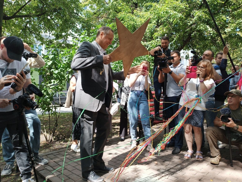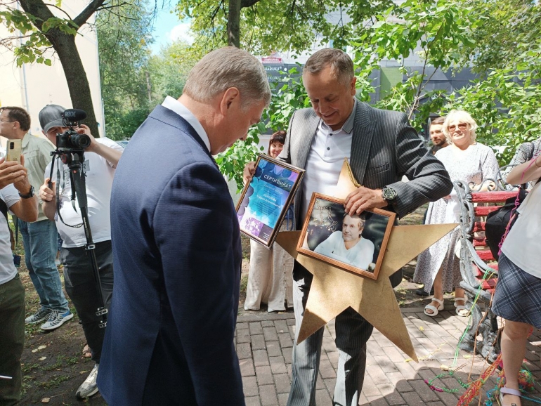 Артист, прибывший на открытие своей звезды, встал возле нее. В руках - фанерный дубликат и подтверждающий именной сертификат в рамочке.