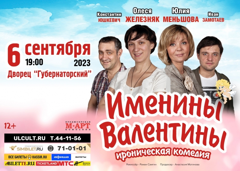 6 сентября в 19.00 в «Губернаторском» пройдет Спектакль «Именины Валентины». Он поможет зрителям заглянуть в будущее и оглянуться на прошлое, разбудит даже в самых черствых сердцах теплые и нежные чувства к героям, заставит смеяться серьезных и искушенных ценителей комедии. Уморительная, заразительная Олеся Железняк покорит зрителей своей непосредственностью и талантом острохарактерной комедийной актрисы, романтичная Юлия Меньшова добавит лиризма, а мужественный Константин Юшкевич придаст дамам сил бороться за свою любовь любыми средствами.