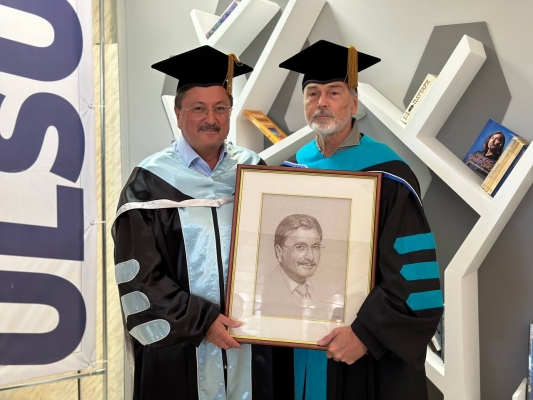Сегодня, 1 сентября, во время торжественной линейки в УлГУ известный художник, наш земляк, декан факультета культуры и искусств Никас Сафронов вручил ректору Борису Костишко его портрет, который написал собственноручно.