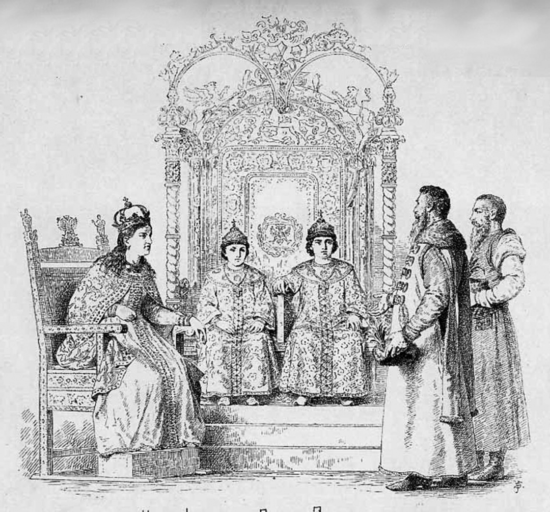 Царевна Софья слева и цари Петр Первый и Иван Пятый на тронах: