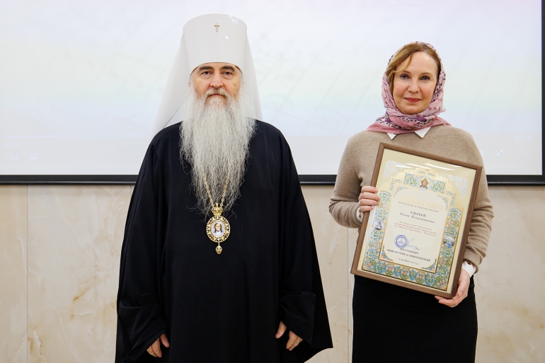 За благотворительную помощь в строительство нового здания воскресной школы митрополит Лонгин вручил Архиерейские грамоты Елене Ежовой, Владимиру Скрипко и Геннадию Ледаеву, а также благодарственные письма другим благотворителям.