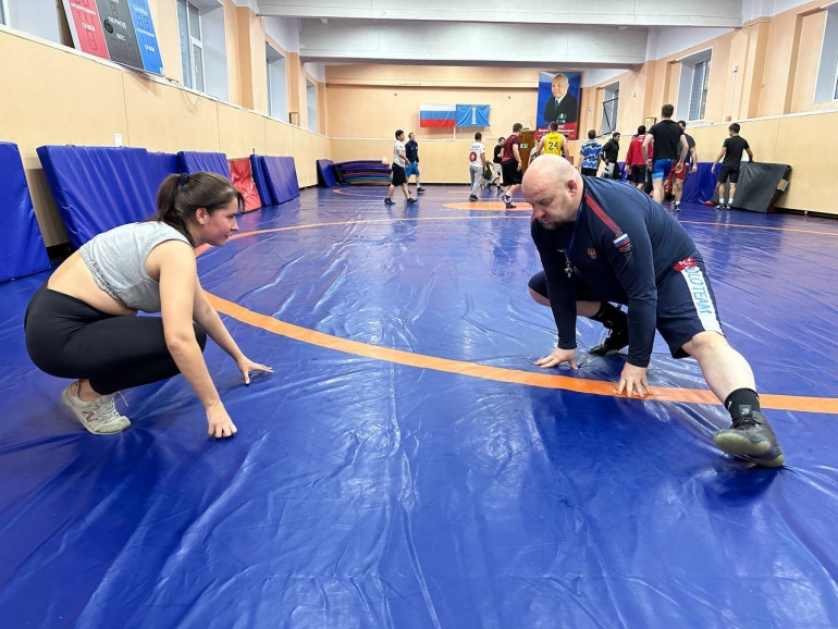 Изначально предполагалось, что Александр Николаевич проведет для корреспондента 73online.ru тренировку по борьбе, и на встречу отправилась Ваша Даша Лена. Но планы поменялись. Во-первых, женская борьба и мужская все же разные. Во-вторых, у меня совсем нет в ней опыта и соответствующей подготовки (три тренировки в неделю в спортзале не в счет). В-третьих, Александр Николаевич долго меня уверял, что в его возрасте он может только рядом стоять, а не показывать борцовские приемы (что, конечно, неправда). Поэтому решили остановиться на разминке.