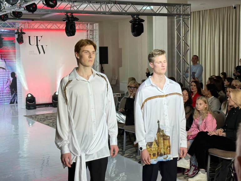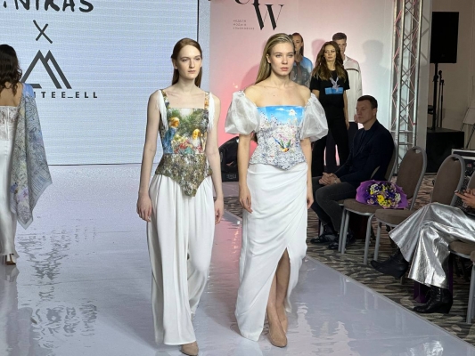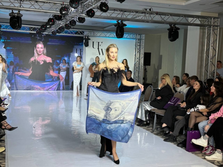На подиум вышли модели, которые продемонстрировали корсеты, платья, платки, жакеты, блузки и бомберы, на которых изображены картины известного в России художника.
