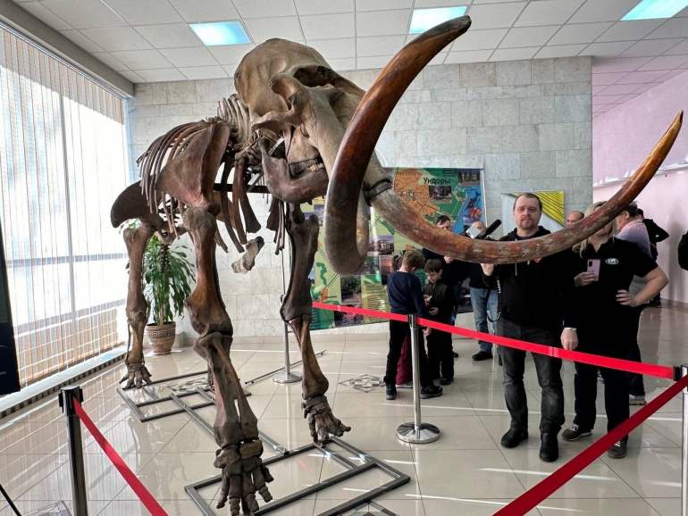 Рядом представлен уникальный скелет мамонтенка. «Это реальный размер мамонта, причем это не самый крупный. Уникальность этого скелета в том, что он полный. Обычно у скелетов не хватает зубов — это травоядные животные, а тут полный зубной ряд. Очень интересные плюсны ног, лап, которые сохранились все до косточек. Соответственно, бивни полированные — все настоящее. Там нет подделок и поздних 3D-моделей», — говорит Травкин. Эти животные обитали и в наших краях тоже, а было это всего лишь 240 миллионов лет назад!