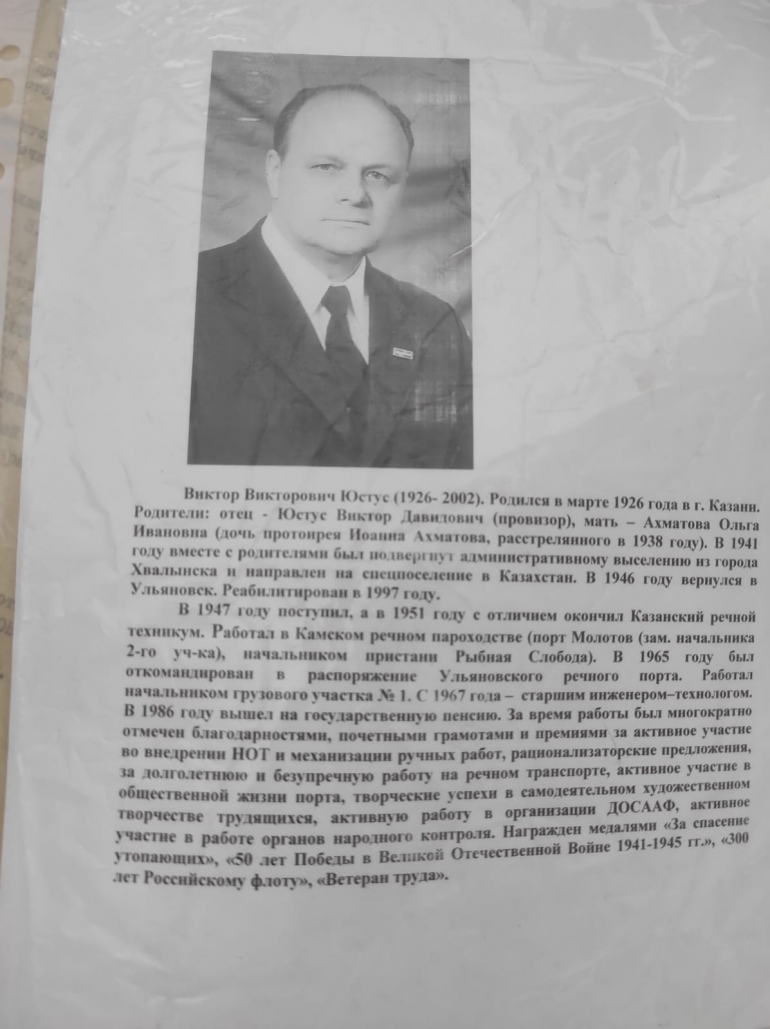 Виктор Юстус работал в ульяновском речном порту с 1965 года. В 1986 году он вышел на пенсию. За эти годы был отмечен благодарностями, грамотами, премиями за участие в общественной жизни речпорта и творческие успехи. Так, например, он организовал в речпорту заочную школу любителей фотографии для сотрудников, занимался плотническим делом, сотрудничал со школой ДОСААФ.