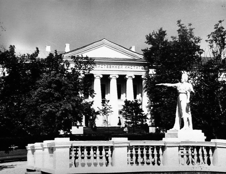 Скульптурная группа и баллюстрада на Венце на фоне здания сельхозинститута, 1956: