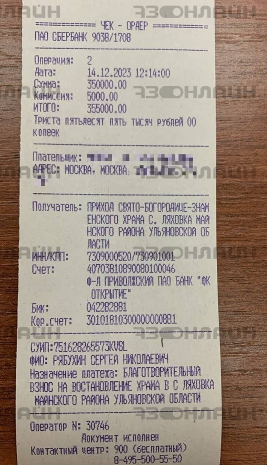Чек, подтверждающий пожертвование на храм