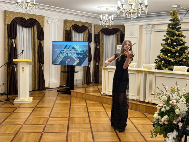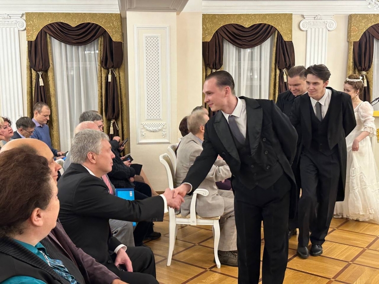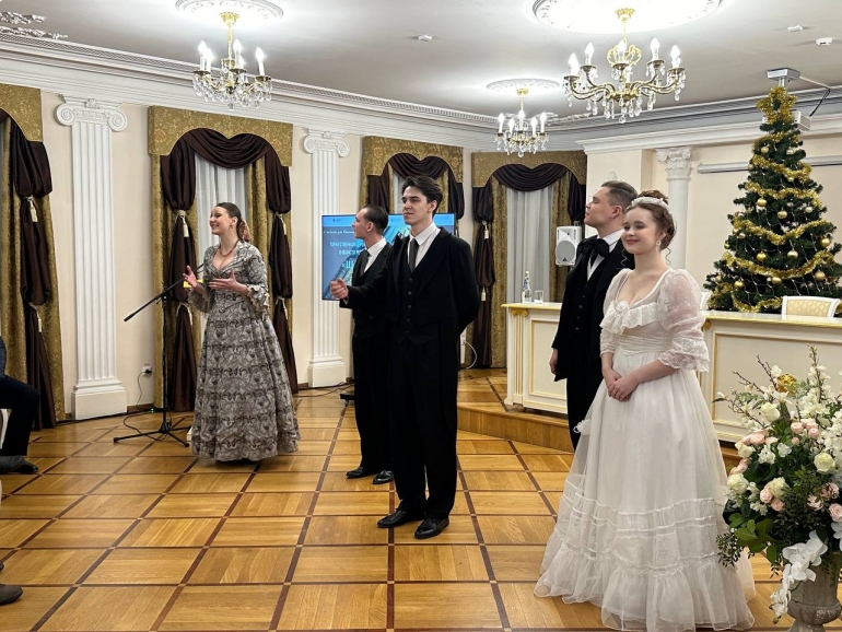 Зал музея наполнен красотой и стилем. Гости начали подходить задолго до начала мероприятия и коротали время за светскими беседами. Атмосфера - новогодняя. Украшенная елка, приятная скрипичная музыка, звонкие голоса и смех. Элегантные актеры в нарядах XIX века приветствуют гостей, звучит романс «Кавалергарда век недолог».