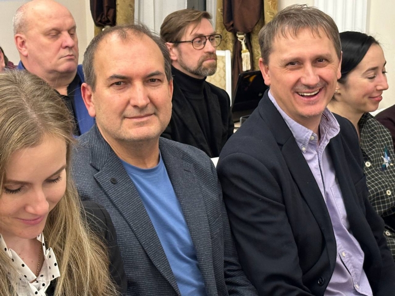 Руководитель молодежного театра Алексей Храбсков - в тотал-блэк. По соседству разместились директор театра кукол Александр Колтун и глава «Ульяновсккинофонда» Сергей Братищев. Очень серьезные люди. Сосредоточенно ждут начала церемонии.