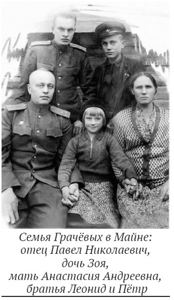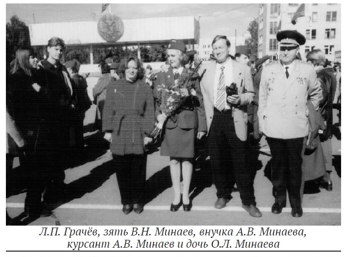 Грачёвы могут гордиться тем, как сложилась жизнь их дочери Ольги Леонидовны, родившейся в Майне, и её семьи. Ныне она – профессор, заведующая кафедрой иностранных языков Московского военного института пограничных войск ФСБ РФ, автор учебных пособий «Базовый курс английского языка», «Частная методика преподавания иностранного языка» и других научных работ. Её муж, Минаев Владимир Николаевич, сейчас полковник, командир войсковой части, тоже профессор Академии военных наук, член-корреспондент Академии проблем качества, лауреат Государственной премии в области науки и техники. По стопам деда и родителей пошла внучка Анастасия. Окончив в прошлом году с золотой медалью военный институт, она вместе с мужем, капитаном Евгением Першиным, успешно учится в адъюнктуре того же вуза.