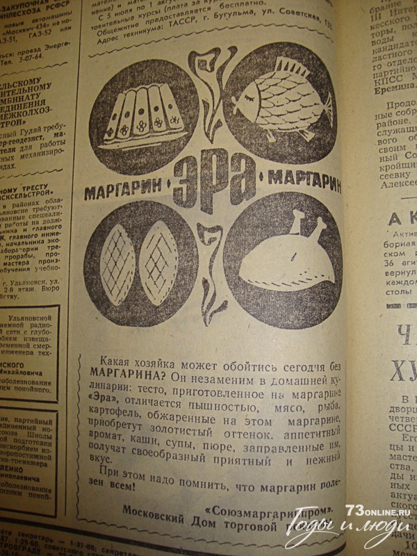 Какая хозяйка может обойтись сегодня без маргарина? Он незаменим в домашней кулинарии: тесто, приготовленное на маргарине «Эра», отличается пышностью, мясо, рыба, картофель, обжаренные на этом маргарине, приобретут золотистый оттенок, аппетитный аромат, каши, супы, пюре, заправленные им, получат своеобразный приятный и нежный вкус.