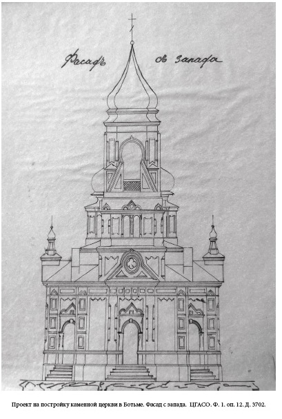 3) главной архитектурной и духовной доминантой для жителей Ботьмы с 1907 г. была каменная Никольская церковь; службы в ней начались с 1910 г.; имела красивые и гармоничные архитектурные формы, и декоративные элементы; закрыта в 1941 г., взорвана в 1955 г.;