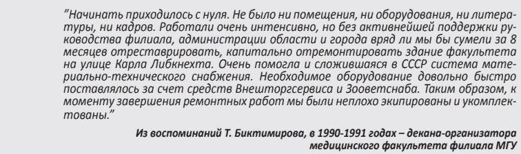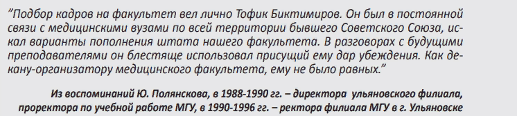 Из Таджикского мединститута на предложения о переводе в ульяновский филиал откликаются заведующие кафедрами по направлениям клинической фармакологии, пропедевтики внутренних болезней и врачебного контроля лечебной физкультуры Виктор Трубников, Галина Грачева и Тамара Куликова. Команду дополняют ученые-практики в области акушерства и гинекологии Фильзя Измайлова и Лариса Трубникова, которая в 1995 году становится первой в истории филиала женщиной-деканом.