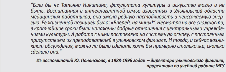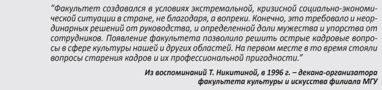 Возглавляя центральное областное учреждение культуры на протяжении двух с половиной десятков лет, Татьяна Никитина как никто разбирается в современной культуре, понимает все ее внутренние механизмы работы. По ее приглашению, Елена Силантьева, как заведующая отделением указанной школы искусств, переходит на работу в филиал для решения множества организационных и содержательных вопросов. Молодая команда делает ставку на привлечение к работе авторитетных деятелей в сфере культуры и активное участие факультета в реализации государственной политики на территории региона.