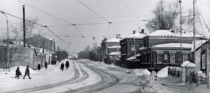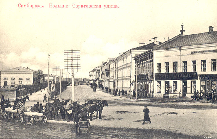 Старинную открытку, изображающую Большую Саратовскую, главную улицу губернского Симбирска, можно лирично назвать: «Первый снег в Симбирске». Снег запорошил дорогу, с тротуаров его откинули дворники. Видно, сколь неинтенсивным было в старину движение – на большом пространстве мостовой снег лежит, почти нетронутый, истоптанный только человеческими ногами.