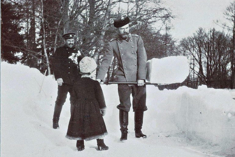Чистка снега считалась хорошей гимнастикой, и этого занятия не чурались сильные мира сего – сохранилась масса фотографий императора Николая II и его августейшего семейства за подобным занятием.