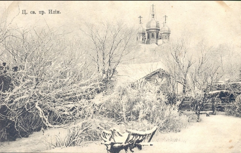 Симбирск в снегу. Вид на Ильинскую церковь, располагавшуюся между гостиницей Венец и Ленинским Мемориалом. Начало 20 века: