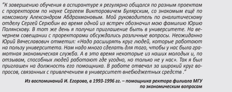 К формированию новой экономической политики привлекается аспирант филиала МГУ, штатный преподаватель экономфака и аналитик Симбирской товарно-сырьевой биржи Игорь Егоров. В период с 1993 по 1996 год он работает на позиции помощника ректора по экономическим вопросам.
