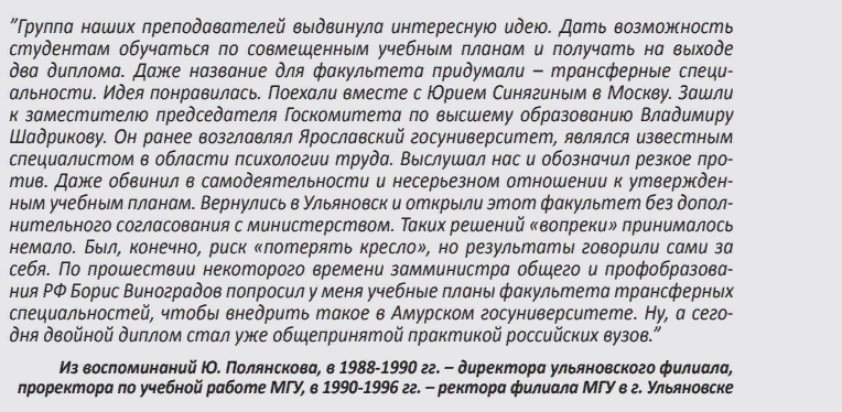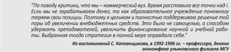 В восьмой главе мемуаров «Стремление опередить время: история становления ульяновского филиала МГУ» первый ректор, а ныне – президент Ульяновского государственного университета Юрий Полянсков рассказал, за счет чего молодому российскому вузу удавалось всполнять дефициты бюджета.