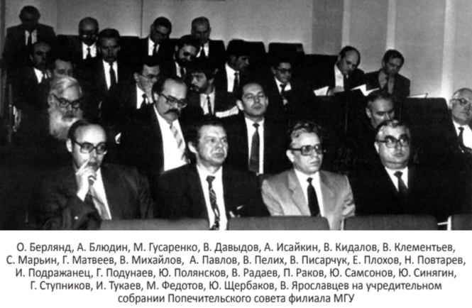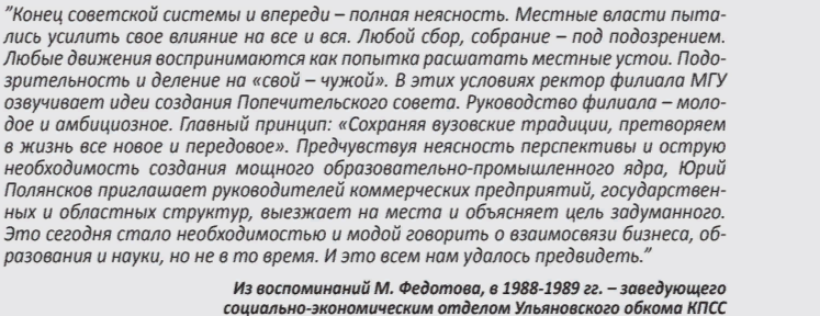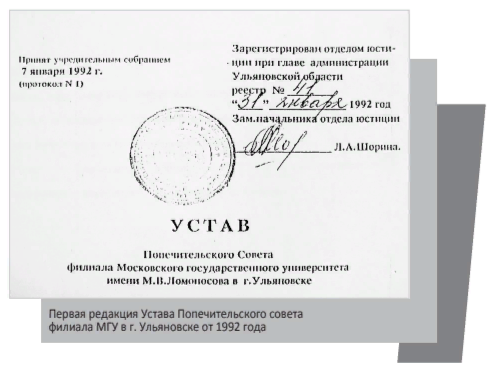 Учреждение Попечительского совета при филиале МГУ планируется на октябрь 1989 года, но состоится это событие по прошествии двух с лишним лет. Длительность этого периода объясняется комплексом совершенно различных, но, по-своему, определяющих причин. Организации пытаются адаптироваться к новым реалиям новой страны на фоне наблюдаемого распада СССР. На посту первого секретаря ульяновского обкома КПСС Юрия Самсонова сменяет Юрий Горячев. Кадровые перестановки фиксируют завершение этапа всемерной, дружеской поддержки нового ульяновского вуза со стороны областной администрации. В это же время ректорат ведет уточнение и согласование уставных задач и механизмов сотрудничества с будущими попечителями. Подбирается кандидатура человека, который возьмет на себя решение множества содержательных вопросов в организации работы новой структуры.