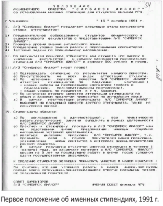 Российско-американское предприятие «Симбирск-Диалог» выходит с инициативой о персональном поощрении лучших студентов филиала МГУ. В октябре 1991 года Ученый совет рассматривает вопрос об установлении именных стипендий. В документе описаны этапы конкурсного отбора, права предприятия и обязательства стипендиатов. Кандидаты на стипендию определяются в ходе предварительного собеседования, проверки знания английского языка и работы с персональным компьютером.