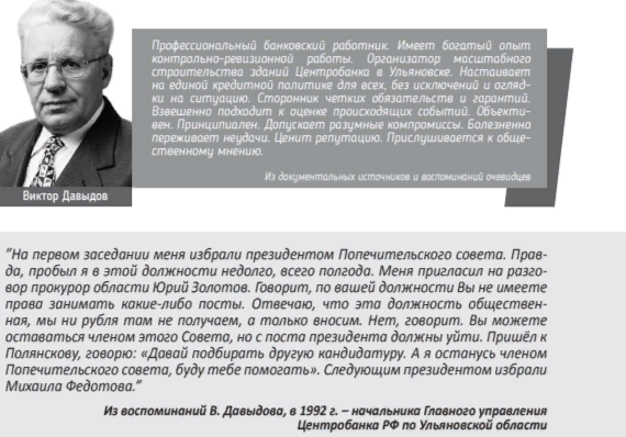 Высшим органом управления объявляется Общее собрание. На выборной основе формируются президиум и контрольно-ревизионная комиссия. В состав первого президиума входят хорошо известные в городе Олег Берлянд, Анатолий Блюдин, Сергей Марьин, Виктор Михайлов, Михаил Федотов. На пост первого президента Попечительского совета избирается начальник Главного управления Центробанка РСФСР по Ульяновской области Виктор Давыдов. Исполнительным вице-президентом становится Юрий Полянсков.