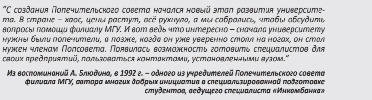 Университетский Попечительский совет становится центром формирования сообщества единомышленников. Каждый из попечителей добился успеха в своей профессии, но не останавливается и стремится улучшить ситуацию и в других сферах. Они демонстрируют, что их участие в благотворительных программах становится хорошим примером и для других достаточно известных, зрелых, неравнодушных людей. Такое отношение попечителей позволяет команде филиала МГУ добиться значительных успехов и профессионального признания в самые первые годы своей работы.