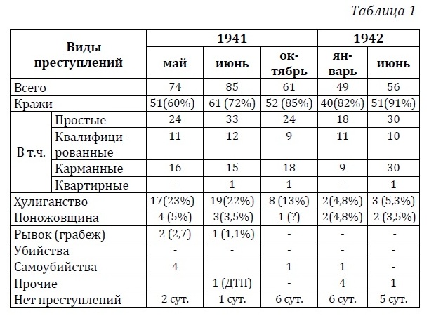 Как видим, максимальный показатель уровня преступности пришелся на июнь 1941 г. – 85 случаев, минимальный – на январь 1942 г. Начиная с октября 1941 г., отчетливо прослеживается тенденция снижения криминальных проявлений. Одновременно растет число суток в месяц, когда преступлений вообще не совершалось – если в мае таких было всего 2, то в октябре 1941 и январе – июне 1942 – от 5 до 6. То есть преступления стали совершаться заметно реже. При этом стабильно высоким оставался лишь удельный вес краж, который не опускается ниже 60 процентов от числа всех совершенных. А в июне 1942 г. поднимался до 91%. При этом большинство краж по квалификации того времени относится к числу «простых». Что это такое?
