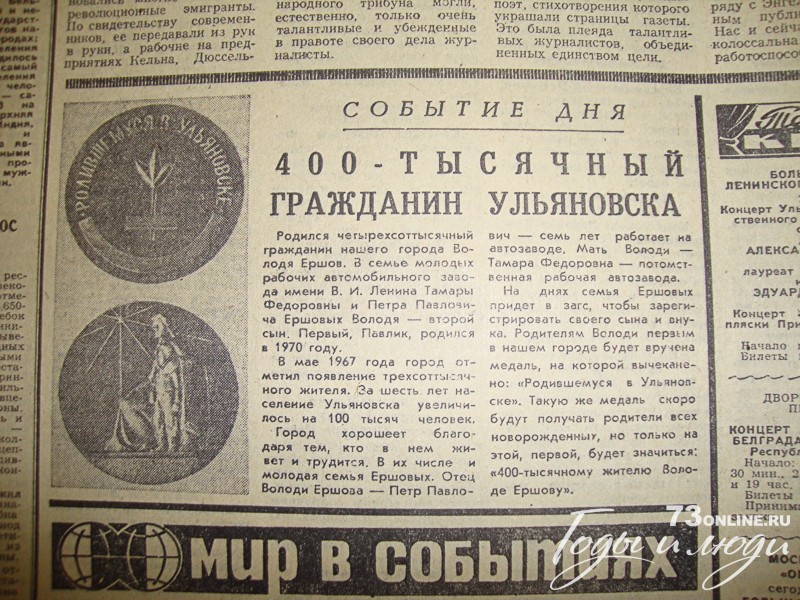 На днях семья Ершовых придет в загс, чтобы зарегистрировать своего сына и внука. Родителям Володи первым в нашем городе будет вручена медаль, на которой вычеканено: «Родившемуся в Ульяновске». Такую медаль скоро будут получать родители всех новорожденных, но только на этой, первой, будет значиться: «400-тысячному жителю Володе Ершову».