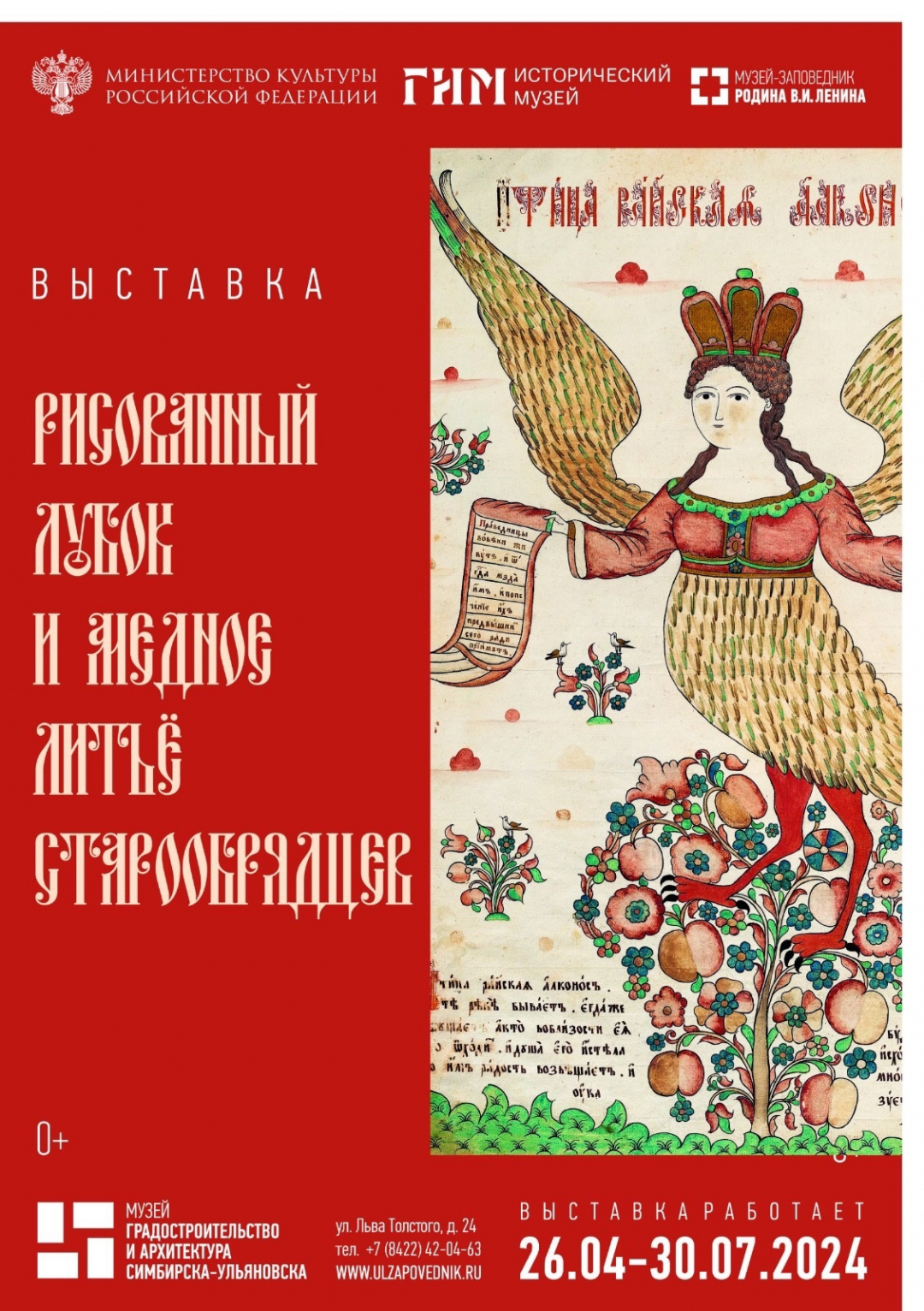 Сегодня в музее «Градостроительство и архитектура Симбирска-Ульяновска» на ул. Льва Толстого, 24 заработала выставка «Рисованный лубок и медное литьё старообрядцев» – новый партнёрский проект Музея-заповедника «Родина В.И. Ленина» и Государственного исторического музея (г. Москва). На открытии присутствовали губернатор Ульяновской области Алексей Русских, министр искусства региона Евгения Сидорова, кураторы выставки из столицы. Проект призван дать полное представление о художественных особенностях рисованного лубка и отразить своеобразие этого вида народного изобразительного искусства.