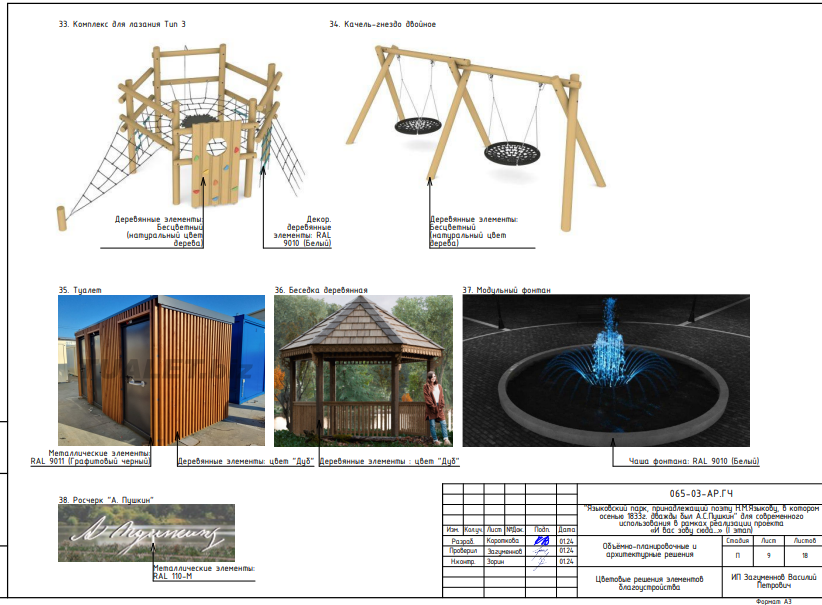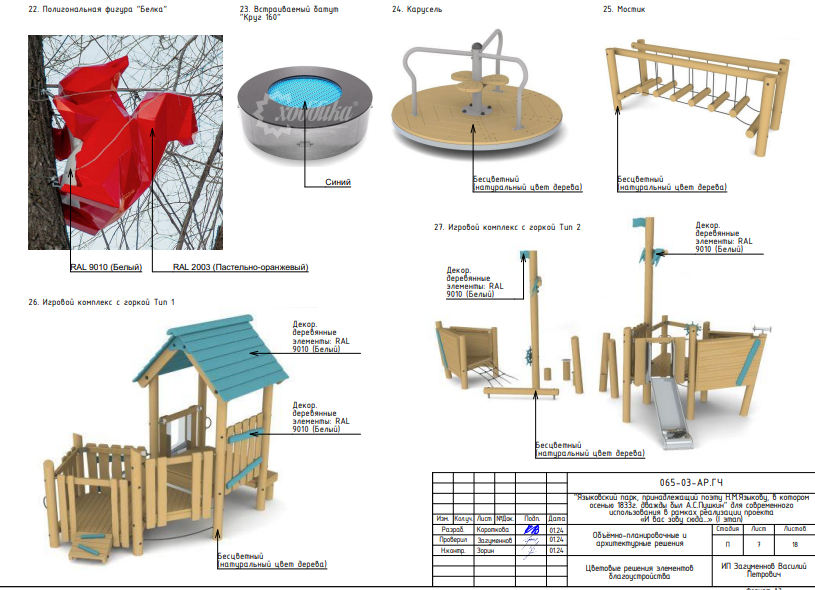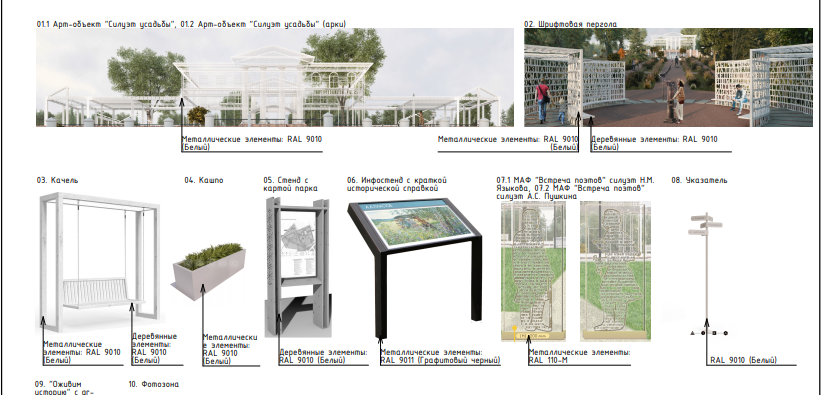 В рамках первого этапа подрядчик проведет демонтаж, земляные работы, проложит тротуары, бордюры, газон, установит: арт-объекты «Силуэт усадьбы», «Встреча поэтов» с силуэтом Н. М. Языкова и А. С. Пушкина, шрифтовую перголу, качели с подсветкой, стенды с картой парка и краткой исторической справкой, указатели, кашпо, «Оживим историю» с QR-кодами, фотозону, урны, скамейки, контейнерную площадку «Экология», велопарковки, песочницы, игровую панель «Меловая доска» и «Животные», росчерк «А. Пушкин», батут, карусель, мостик, игровые комплексы с горками, скалодром и комплекс для лазания, туалеты, беседки и модульный фонтан.