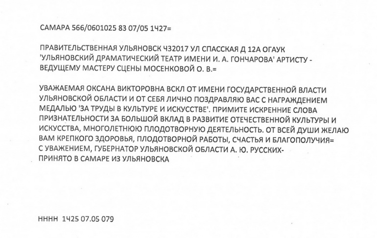 - Роли Оксаны Мосенковой в спектаклях по русской и зарубежной классике принесли Ульяновскому театру драмы и артистке награды на всероссийских и международных театральных фестивалях, успех и зрительское признание на гастролях в России и за рубежом. Выражаю искренние слова признательности Оксане Викторовне за большой вклад в развитие отечественной культуры и искусства, многолетнюю плодотворную деятельность.