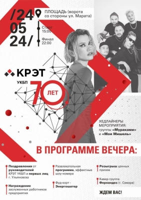 24 мая Ульяновское конструкторское бюро приборостроения отметит 70-летие. В связи с этим для сотрудников будет организован масштабный корпоратив с участием популярных групп «Моя Мишель» и «Мураками».