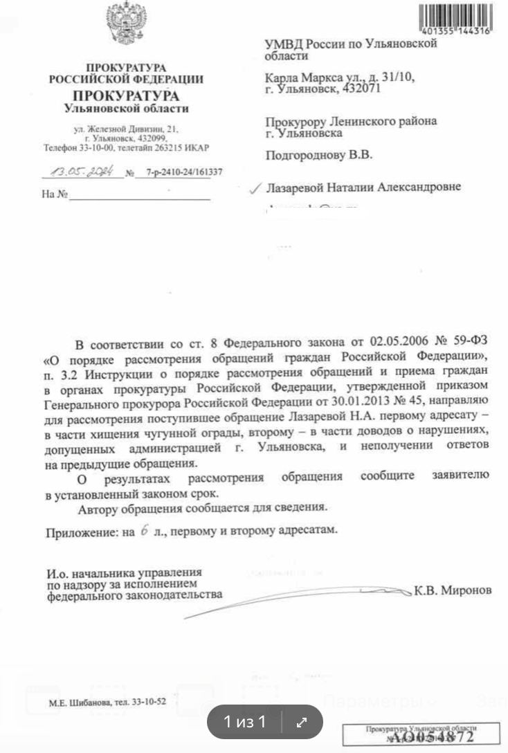 Правозащитница обратилась в Генпрокуратуру. Федеральное ведомство поручило прокурору Ленинского района Ульяновска и областному УМВД начать расследование по факту пропажи ограды.