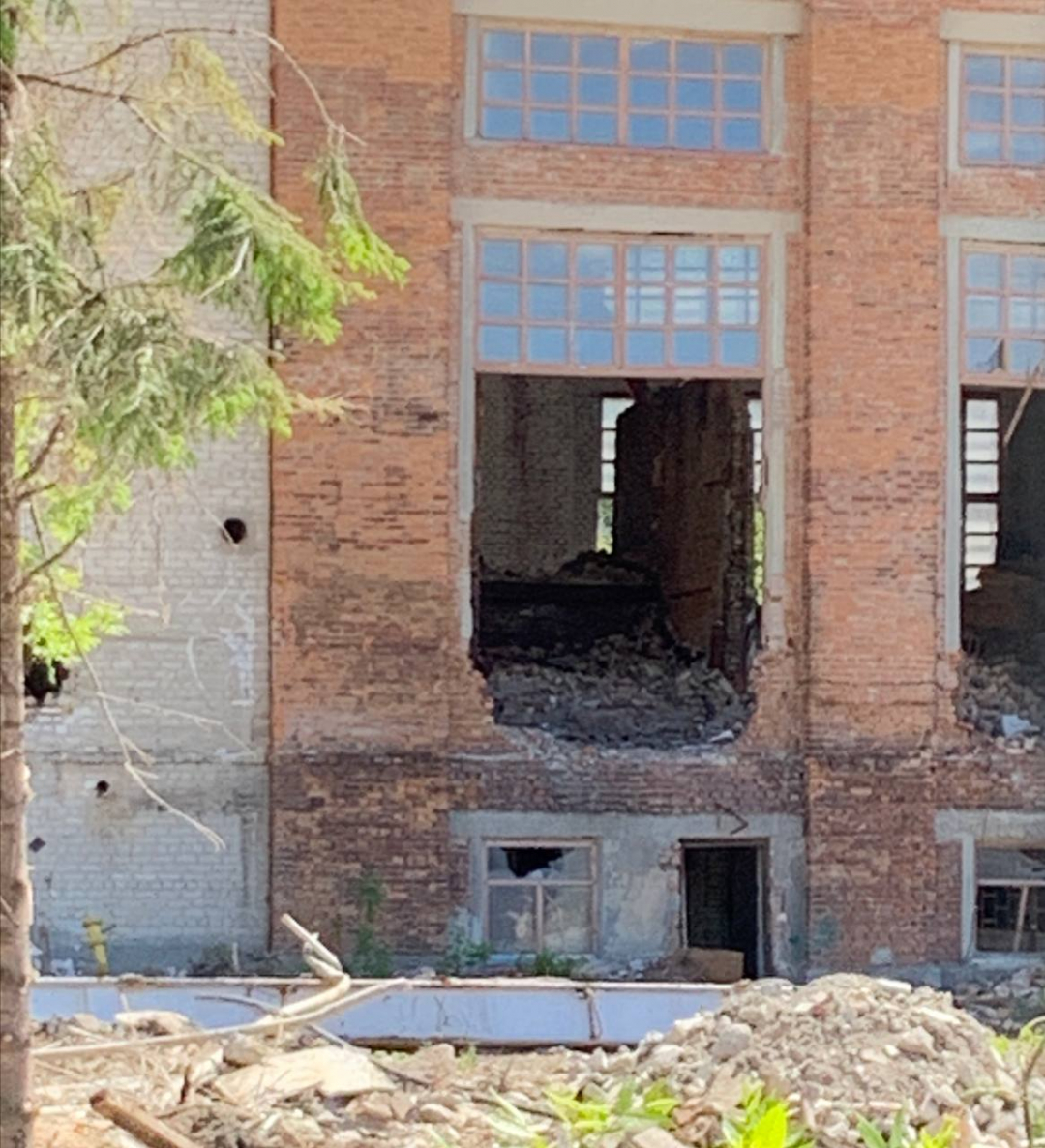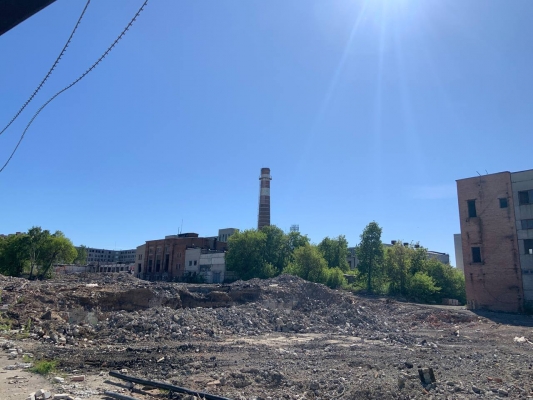 Паспорта объекта нет. Вблизи проходной кипит работа: гремит техника, рабочие машут лопатами и носят камни. Представитель стройки Дмитрий Жаворонков пояснил: «Заканчиваем снос второго объекта. С двумя корпусами уже разобрались». Сроки выполнения работ озвучить он затруднился.