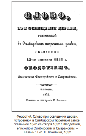 - (2) см.: Феодотий. Слово при освящении церкви, устроенной в Симбирском тюремном замке, сказанное13-го сентября 1852 г. Феодотием, епископом Симбирским и Сызранским. – Казань : Тип. Н. Коковина, 1852. –С. 6–7.