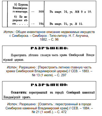 - (23) см.: Разрешено : [Перестроить летнюю главную часть храма Симбирской Владимирской церкви] //СЕВ. – 1883. – № 13 (1 июля). – С. 297.