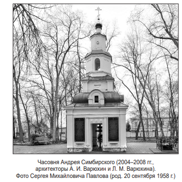 В 1994 г. вновь образованным приходом Всехсвятской церкви на месте уничтоженного кладбища бывшего Покровского (Благовещенского) мужского монастыря в память обо всех погребённых на этом кладбище была сооружена каменная часовня (архитекторы – Александр Иванович (род. 29 февраля 1956 г.) и Ляйля Махмутовна (род. 24 октября 1954 г.)) Варюхины. Освящение часовни-памятника Андрея Симбирского (5) состоялось в День Россиии 360-летия Симбирска Ульяновска – в четверг 12 июня 2008 г. (6).