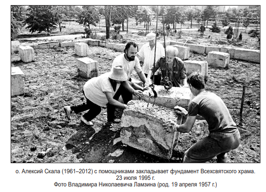 В 1995–1996 гг. западнее места, предназначенного для строительств абудущего собора (Спасо-Вознесенский собор), по инициативе и под руководством о. Алексия Скалы (в миру Алексей Владимирович Скала, 1961–2012) была построена малая (7) деревянная Всехсвятская церковь (архитекторы – А. И. Варюхин и Л. М. Варюхина). Она была устроена в стиле древнерусских деревянных храмов XV–XVII вв. (8) – одноглавый четверик с пощипцовыми завершениями фасадов, с притворами, трапезнойи звонницей.