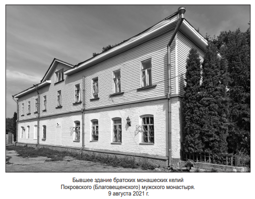 Ещё в 1993 г. церковь обратилась к городским властям с просьбой передать ей двухэтажноездание братских монашеских келий (11), построенное ещё в 1863 г. и являющееся единственным из сохранившихся построек комплекса бывшего Покровского (Благовещенского) мужского монастыря (12). Наконец, в апреле 2001 г. (13) МП «Торгмонтаж» освободило здание и подсобные помещения в пользу Всехсвятской церкви.