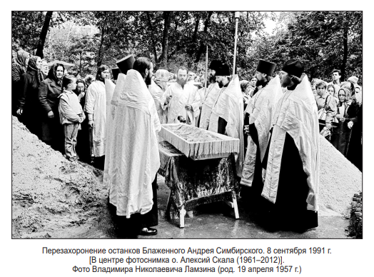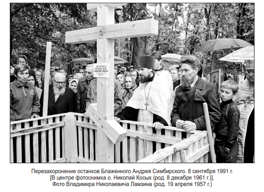 - (15) В канун памяти святого 9 декабря 2015 г. мощи Андрея блаженного были перенесены из Всехсвятской церкви в Спасо-Вознесенский кафедральный собор. Праздничное богослужение возглавил митрополит Симбирский и Новоспасский (в 2015–2019 гг.) Анастасий (в миру Александр Михайлович Меткин, род. 27 августа 1944 г.). Его Высокопреосвященству митрополиту Анастасию сослужили епископ Альметьевский и Бугульминский (с 11 июля 2012 г.) Мефодий (в миру Дмитрий Анатольевич Зайцев; род. 25 октября 1978 г.), епископ Мелекесский и Чердаклинский (с 19 мая 2013 г.) Диодор (в миру Дмитрий Юрьевич Исаев; род. 7 мая1976 г.), епископ Барышский и Инзенский (с 28 октября 2012 г.) Филарет (в миру Вячеслав Викторович Коньков;род. 6 декабря 1963 г.) и священнослужители Симбирской митрополии.