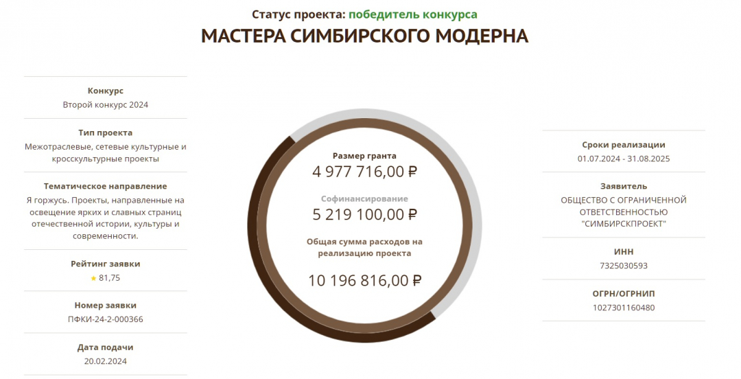 Большой региональный проект «Мастера симбирского модерна» получил поддержку Президентского фонда культурных инициатив – 4,9 млн руб. Цель – создать крупную современную выставку, посвященную выдающимся архитекторам Симбирска-Ульяновска – Ливчаку, Шодэ, Вольсову. 223 подлинника покажут в Москве в музее архитектуры имени А.В. Щусева, а затем отправят в девять регионов России.