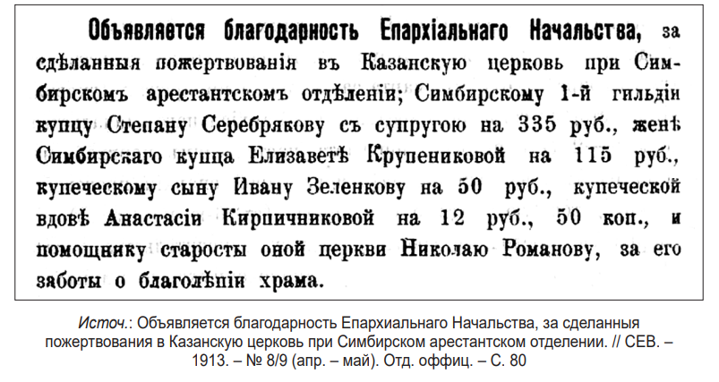 18. Объявляется благодарность Епархиальнаго Начальства, за сделанныя пожертвованияв Казанскую церковь при Симбирском арестантском отделении. // СЕВ. – 1913. – № 8/9 (апр. –май). Отд. оффиц. – С. 80.