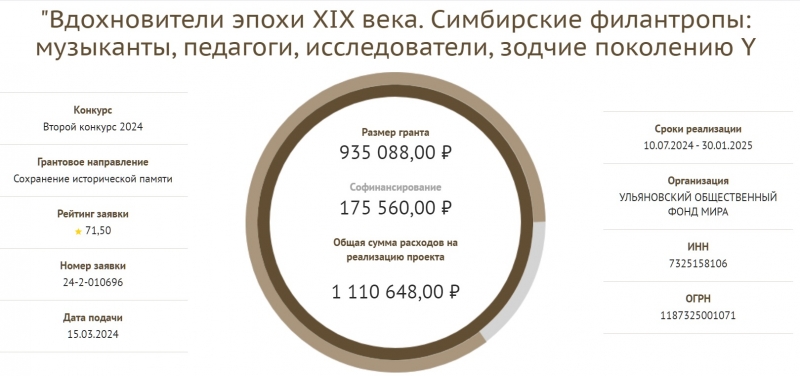 Проект носит название «Вдохновители эпохи XIX века. Симбирские филантропы: музыканты, педагоги, исследователи, зодчие поколению Y». Финансирование направят на создание 10 эпизодов одноименного подкаста, который будет выходить на «Радио России». Героями подкаста станут филантропы XIX века, их жизнь и творческая деятельность.