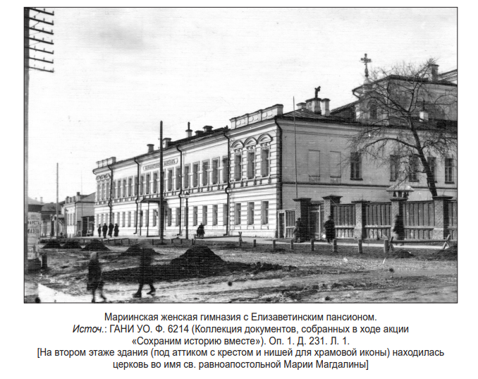 Мариинская церковь была устроена в 1873 г. (1) при Симбирской Мариинской женской гимназии вместо церкви во имя св. царицы Александры, домовой церкви Елизаветинского (Елисаветинского) женского училища, сгоревшей во время катастрофической девятидневной серии пожаров, бушевавших в Симбирске с 13 по 21 августа [с 25 августа по 2 сентября] 1864 г. Новый храм (с одним престолом во имя св. Марии Магдалины) был устроен при содействии действительного статского советника, дворянина и помещика Михаила Авксентьевича Исакова (?–1901) и симбирского купца 2-й гильдии Николая Васильевича Сапожникова (?–?) (2).